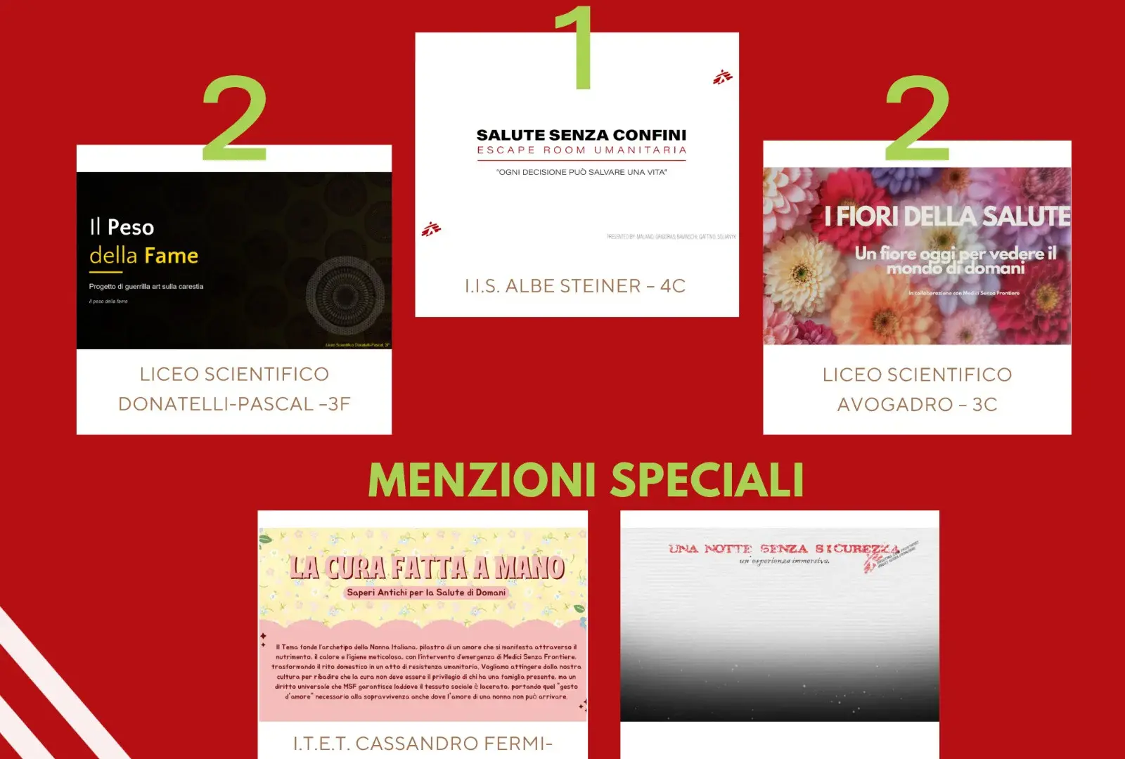 ✨ 1° classificato: classe 4C dell’I.I.S. Albe Steiner di Torino con il project work “Salute senza confini”. Il progetto propone un’escape room umanitaria, pensata per far vivere ai partecipanti le difficoltà operative di un’emergenza sanitaria e sensibilizzare sul lavoro di Medici Senza Frontiere.
